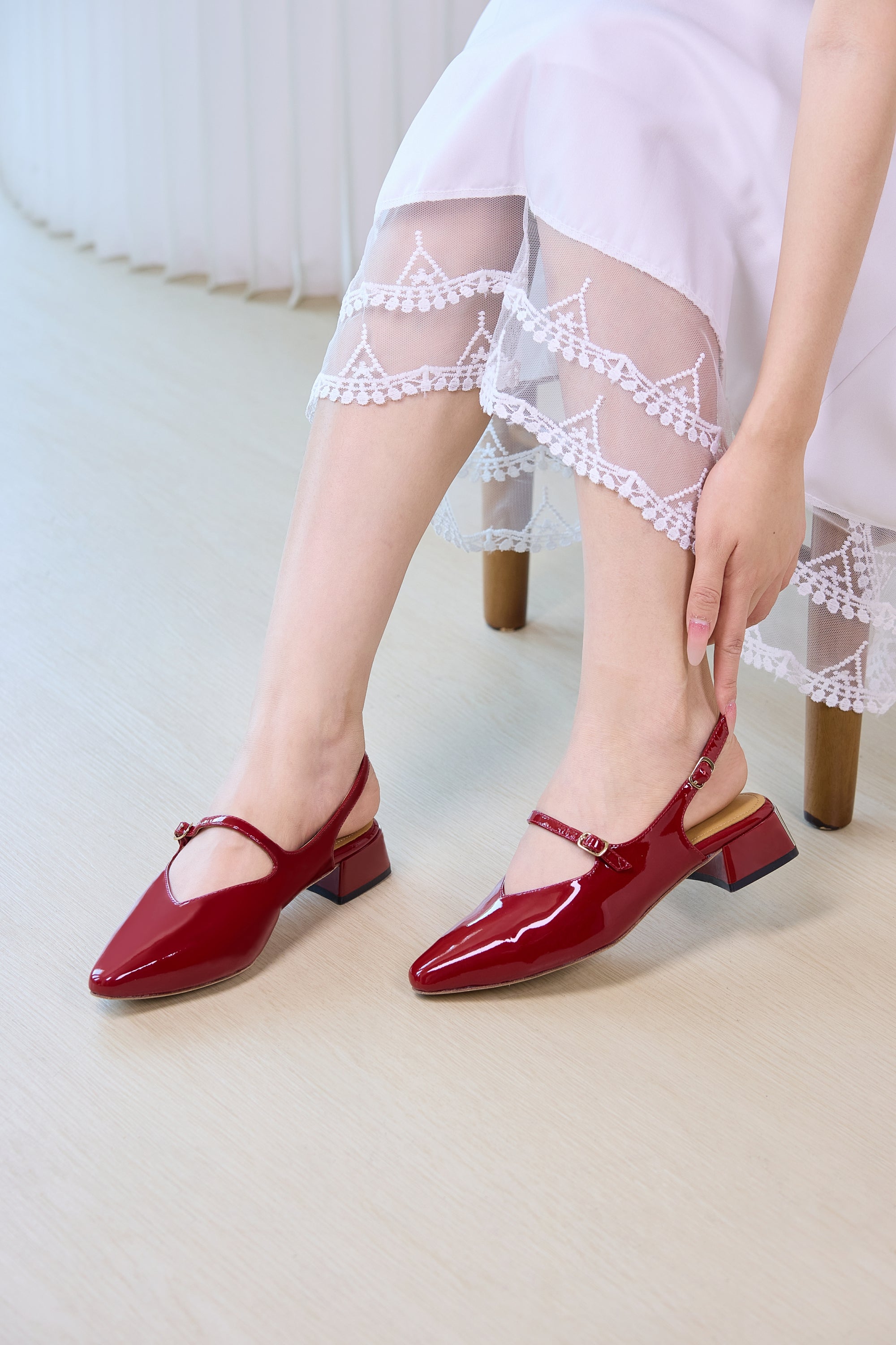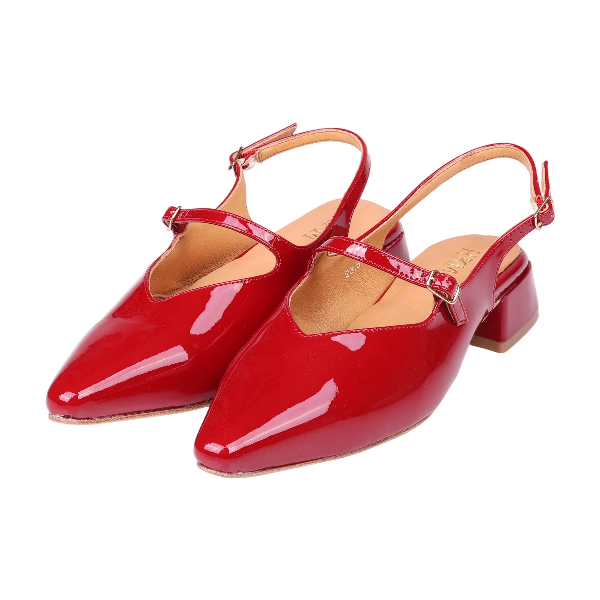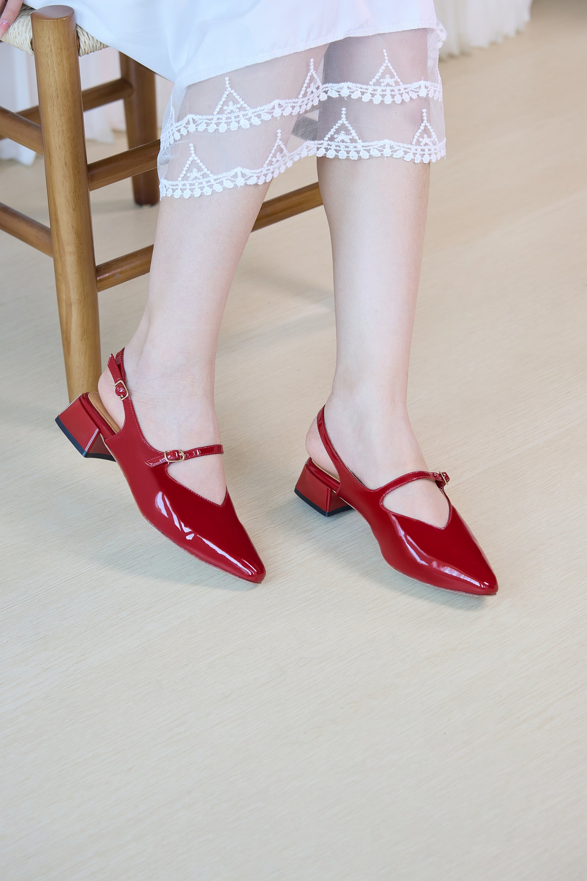 ストラップ パンプス レディース ポインテッドトゥ エナメル調 チャンキーヒール きれいめ 通勤 オフィス 歩きやすい 大人 靴 レッドswl 02