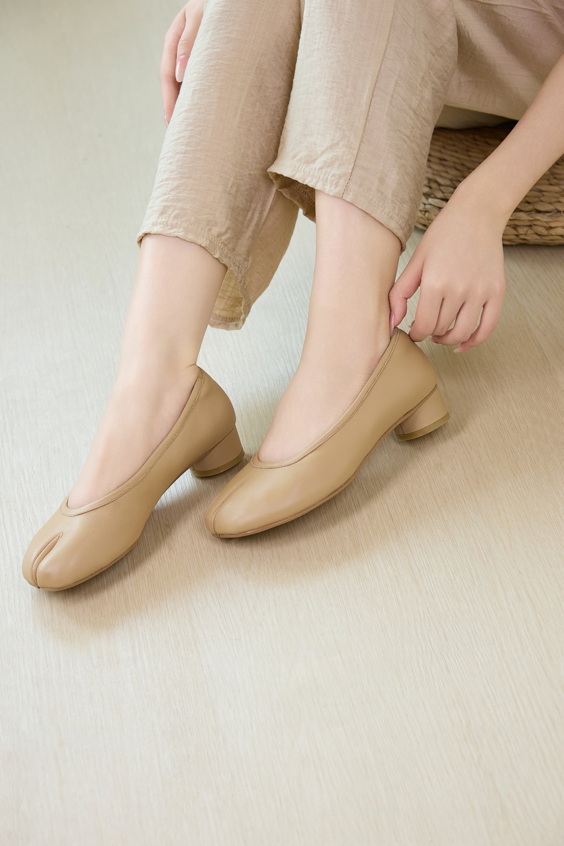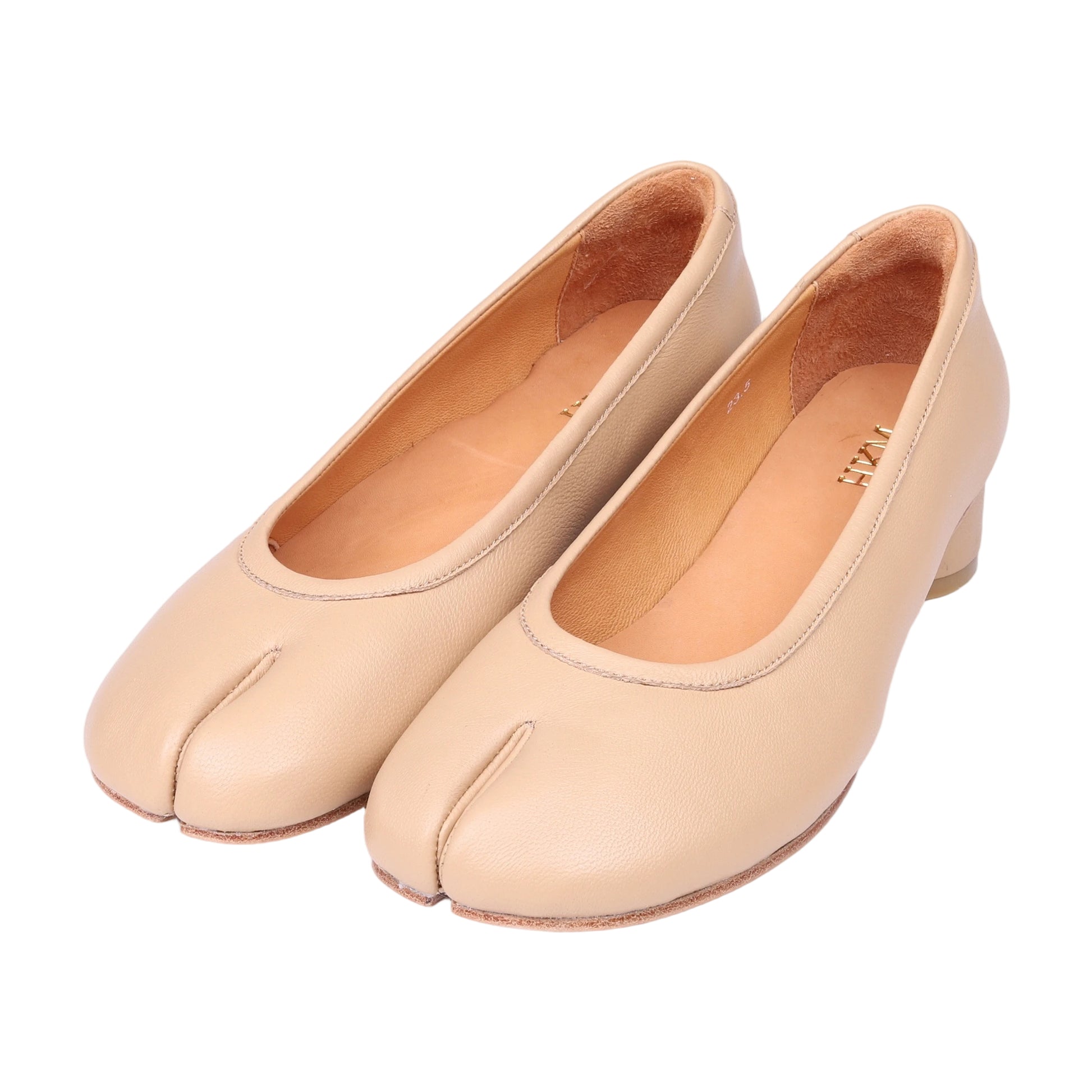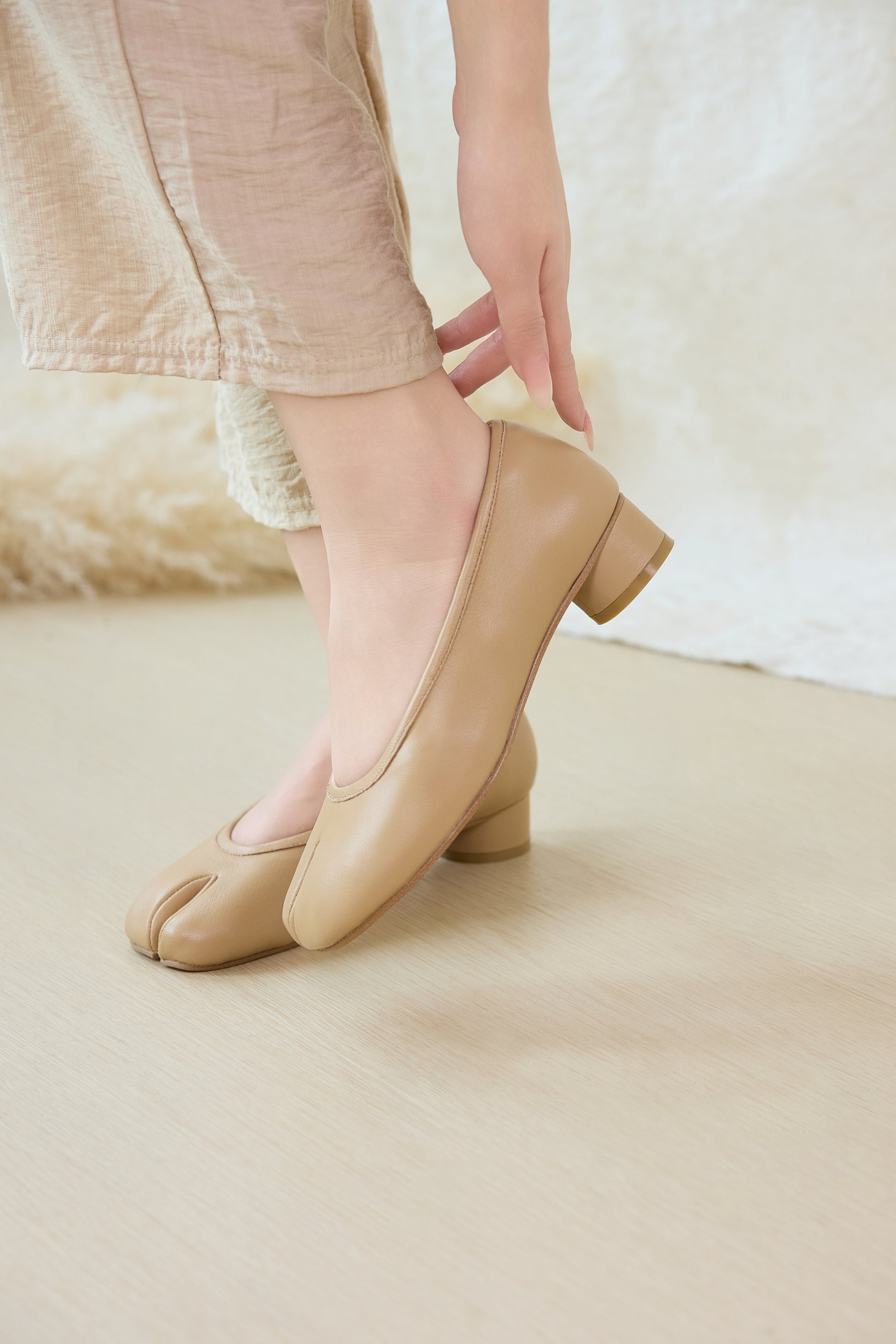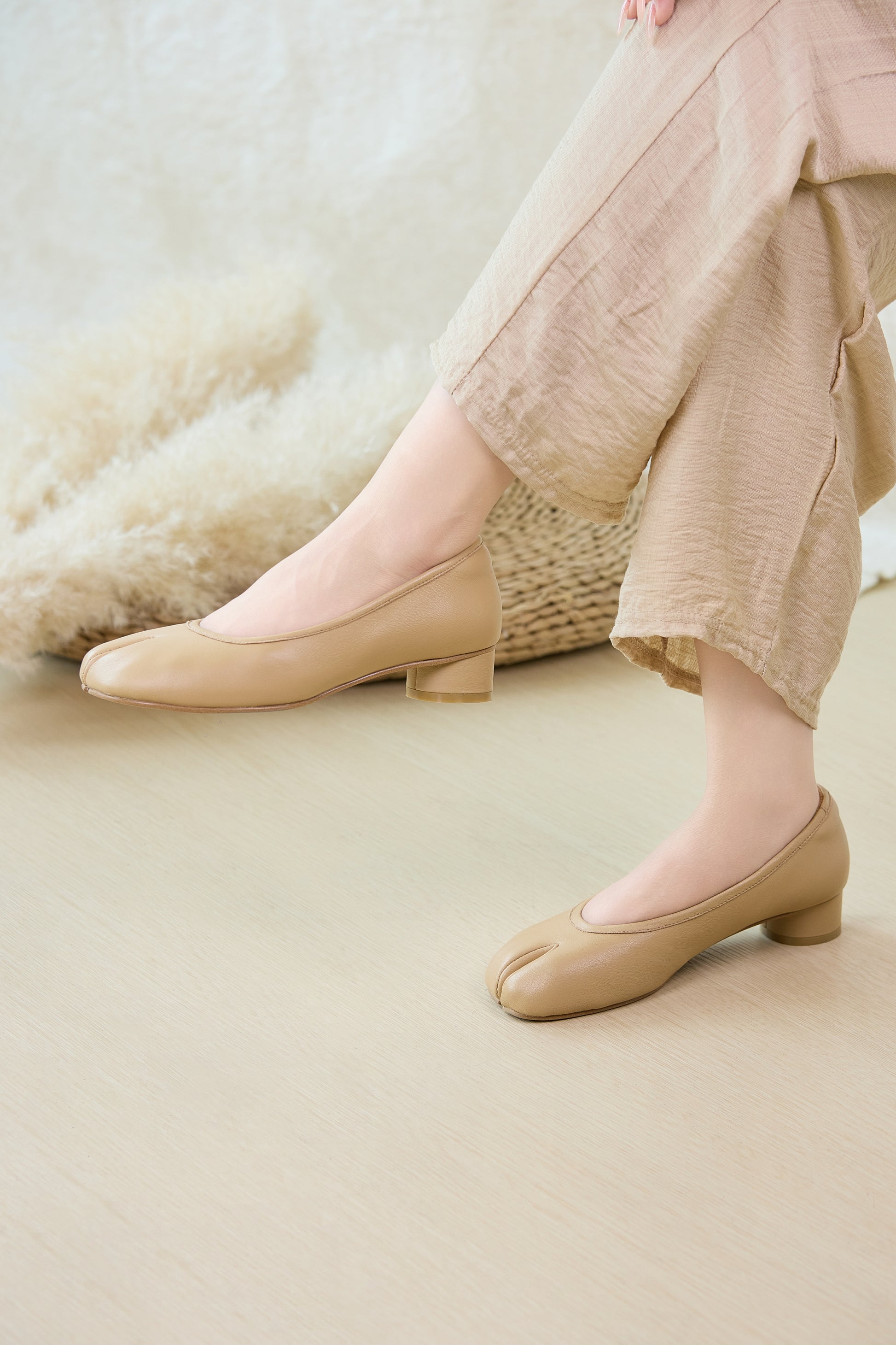 足元にさりげない個性を添える、足袋風デザインのパンプス。 やわらかなベージュカラーとすっきりとしたシルエットが、落ち着きのある上品な印象を演出します。 低めのヒールで安定感があり、長時間の着用でも疲れにくい履き心地。 足袋風のトゥデザインは程よいアクセントになり、シンプルなコーディネートにも自然になじみます。 パンツスタイルはもちろん、スカートやワンピースとも相性が良く、普段使いからお出かけまで幅広く活躍。 個性と上品さをバランスよく取り入れた、大人のための足袋風パンプスです。