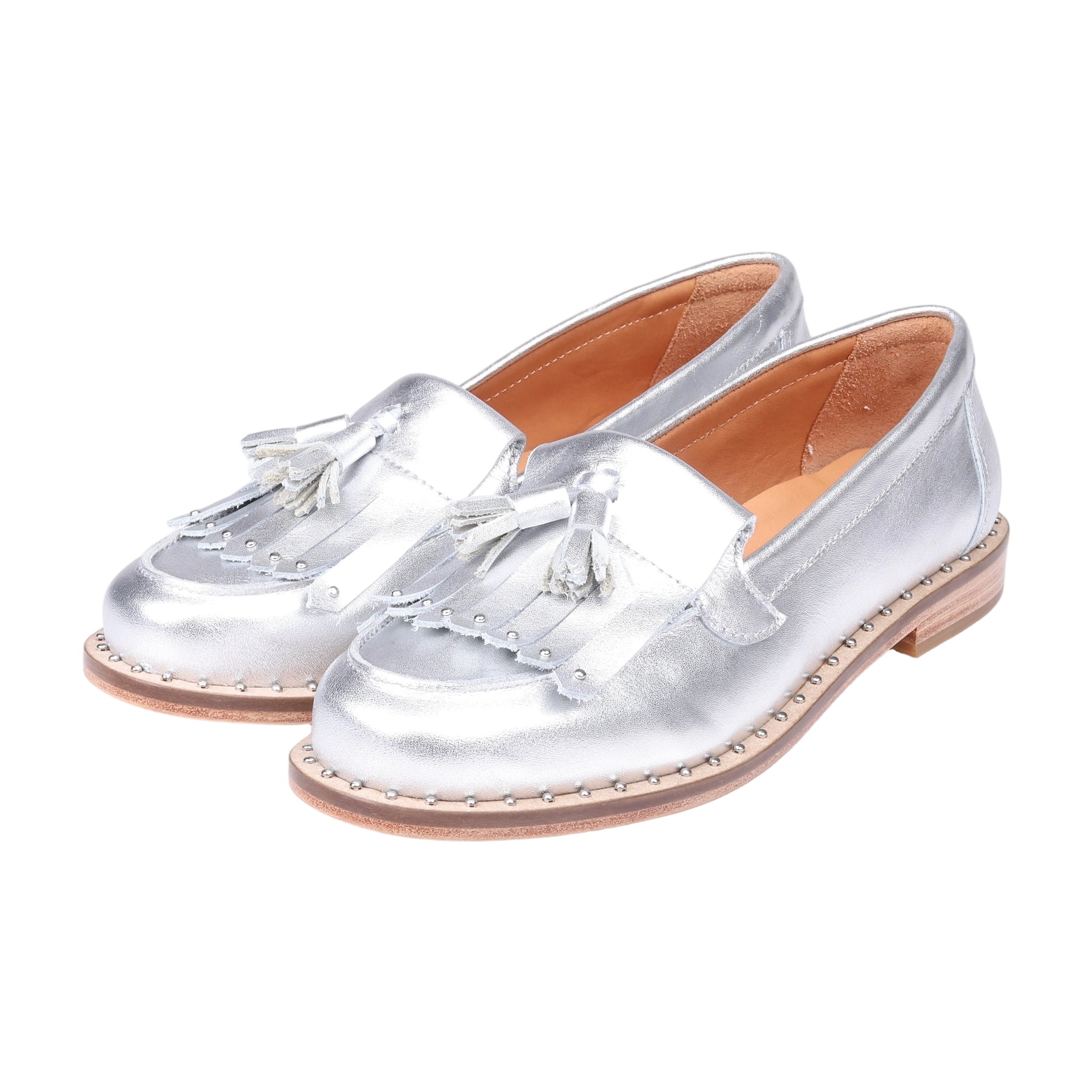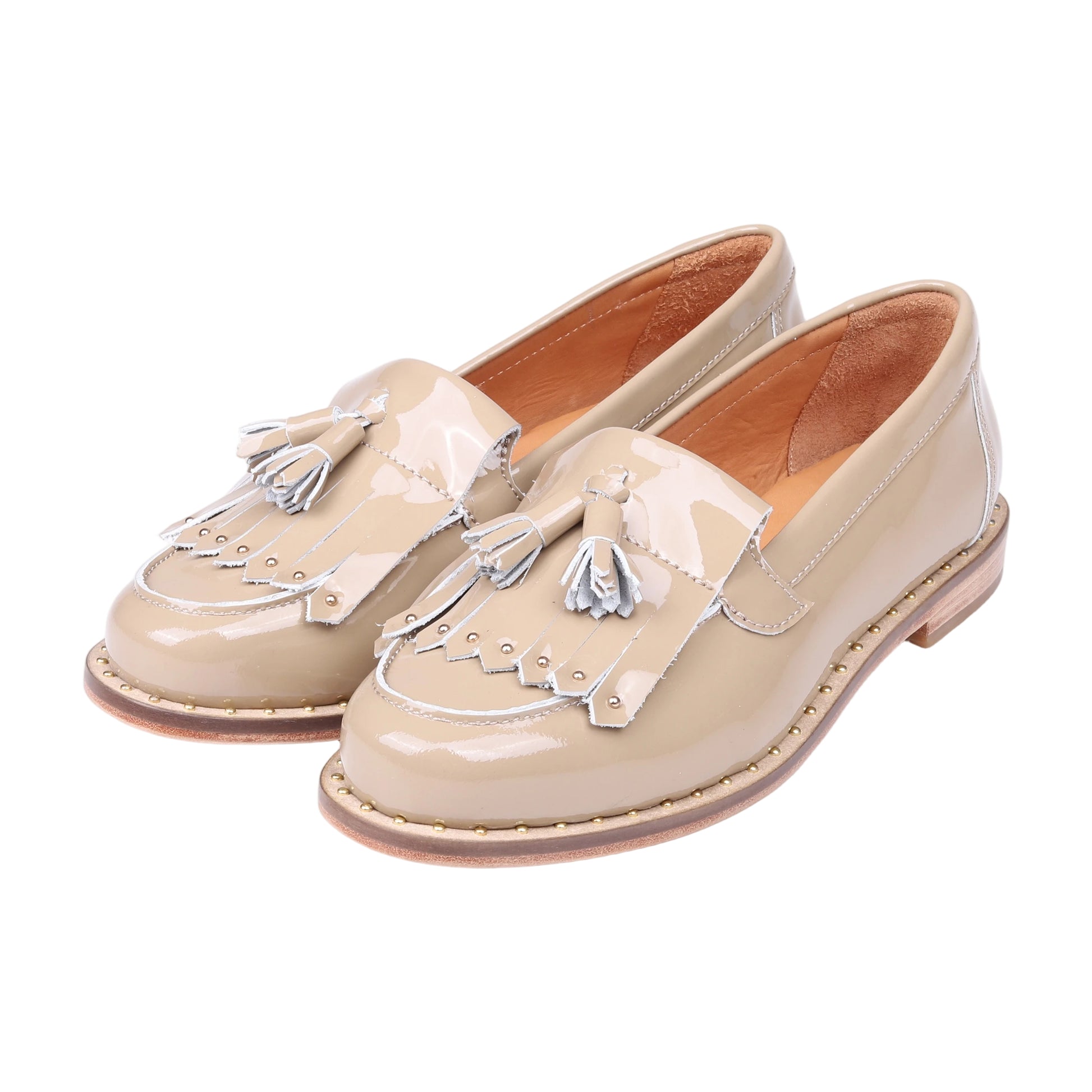艶のあるブラックエナメルが印象的な、タッセル付きローファー。 シンプルなフォルムにタッセルとスタッズディテールを組み合わせ、足元に程よいモード感をプラスしました。 フラットに近い安定感のあるソールで、歩きやすく長時間の着用でも快適な履き心地。 ローファータイプで脱ぎ履きもしやすく、通勤からお出かけまで幅広いシーンで活躍します。 パンツスタイルはもちろん、スカートやワンピースとも相性が良く、コーディネートを引き締めてくれる万能カラー。 上品さと存在感を兼ね備えた、毎日のスタイルに頼れる定番ローファーです