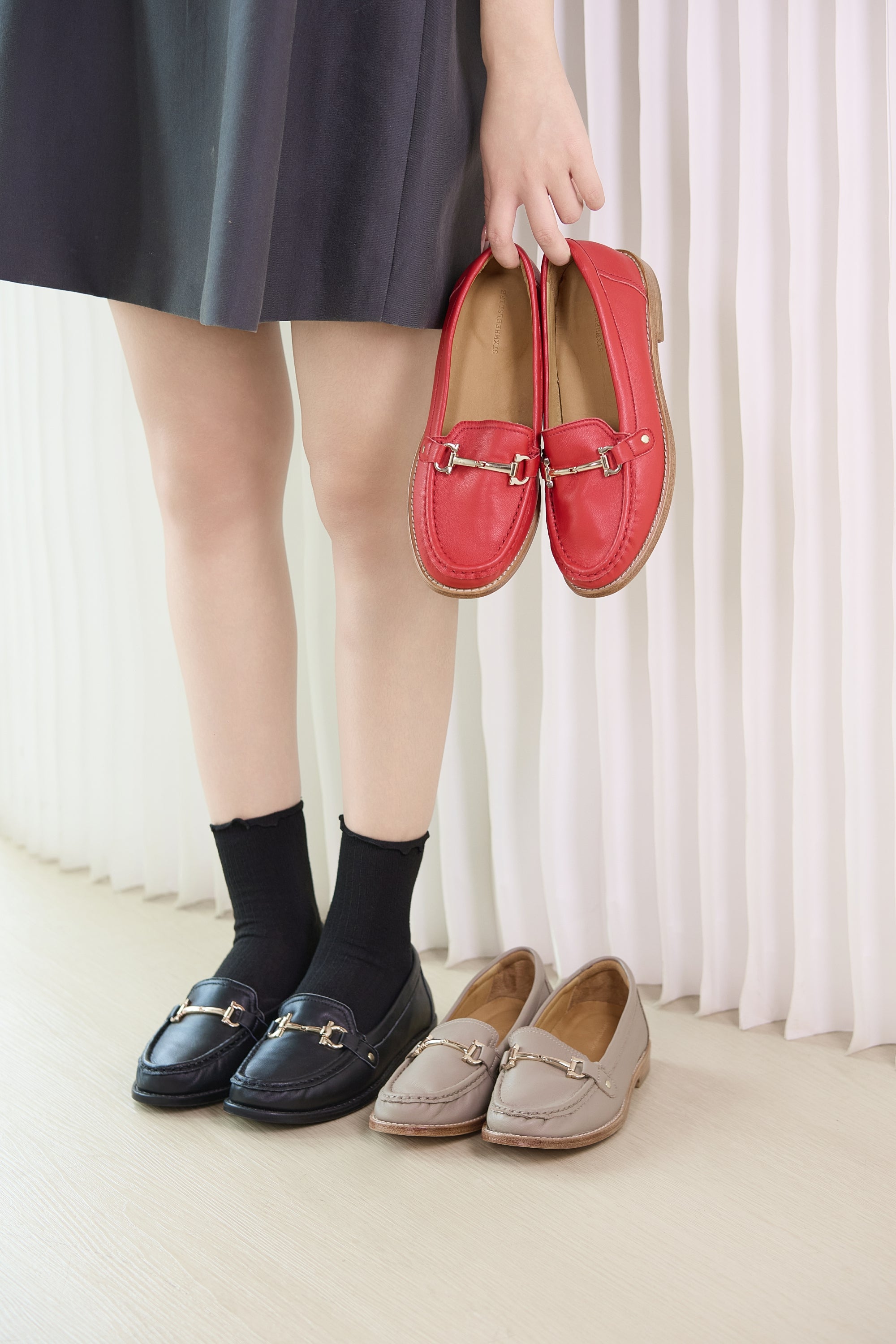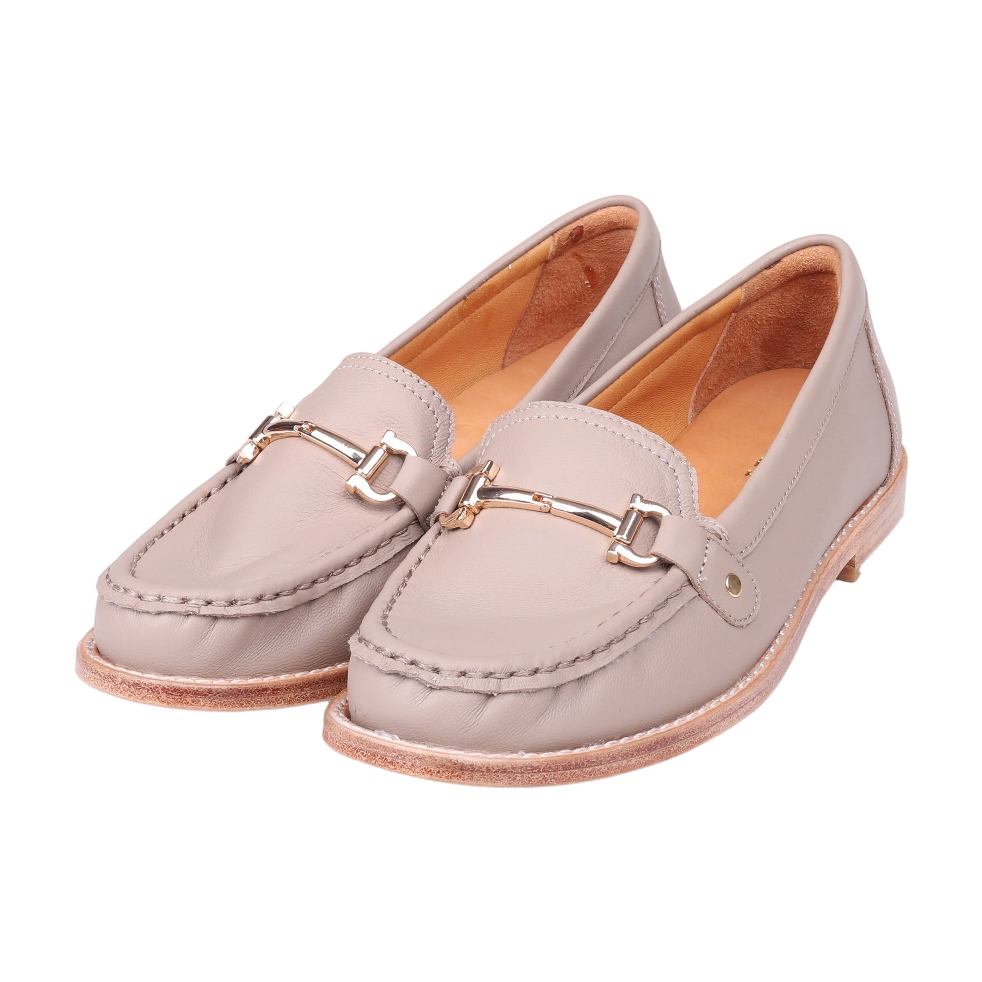やわらかなカラーが上品な印象を与える、ビット付きローファー。 落ち着いた色味にシンプルなビット金具を合わせ、きれいめにもカジュアルにも取り入れやすいデザインに仕上げました。 フラットに近い安定感のあるソールで、歩きやすく長時間の着用でも快適。 ローファータイプのため脱ぎ履きしやすく、通勤やお出かけ、日常使いに幅広く活躍します。 パンツスタイルはもちろん、スカートやワンピースにも合わせやすく、季節を問わず使える万能カラー。 上品で主張しすぎず、毎日のコーディネートに自然になじむ一足です。
