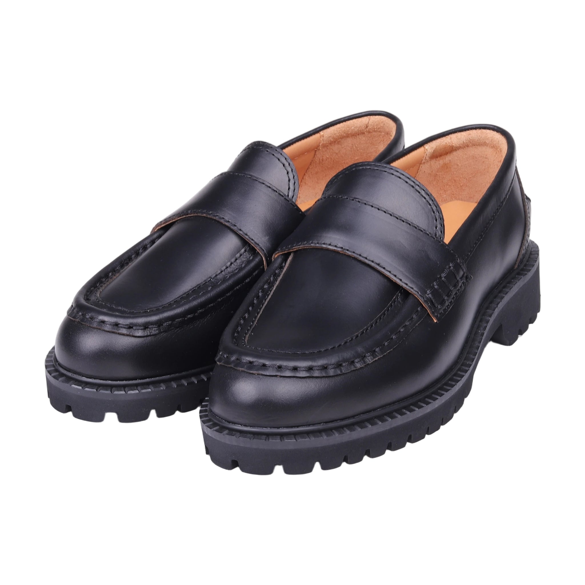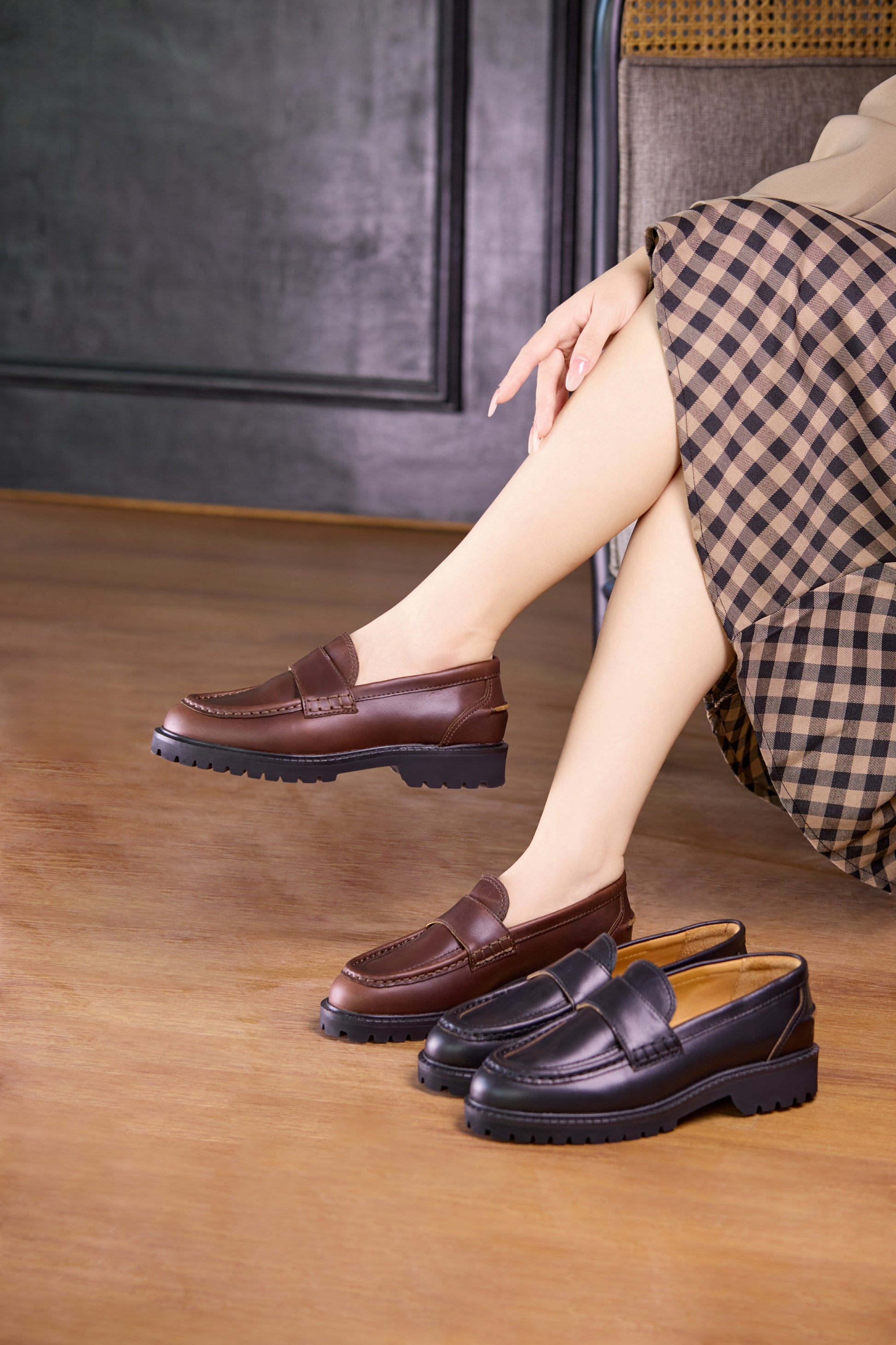 ベーシックなブラックカラーが魅力の、定番デザインの厚底ローファー。 シンプルなベルトデザインとすっきりとしたフォルムで、年齢やスタイルを問わず取り入れやすい一足です。 安定感のある厚底ソールはクッション性に優れ、長時間の歩行でも疲れにくい快適な履き心地。 ローファータイプで脱ぎ履きもしやすく、通勤・通学・日常のお出かけまで幅広く活躍します。 パンツにもスカートにも合わせやすく、オン・オフ問わず使える万能デザイン。 毎日のコーディネートに自然になじむ、長く使える定番ローファーです。