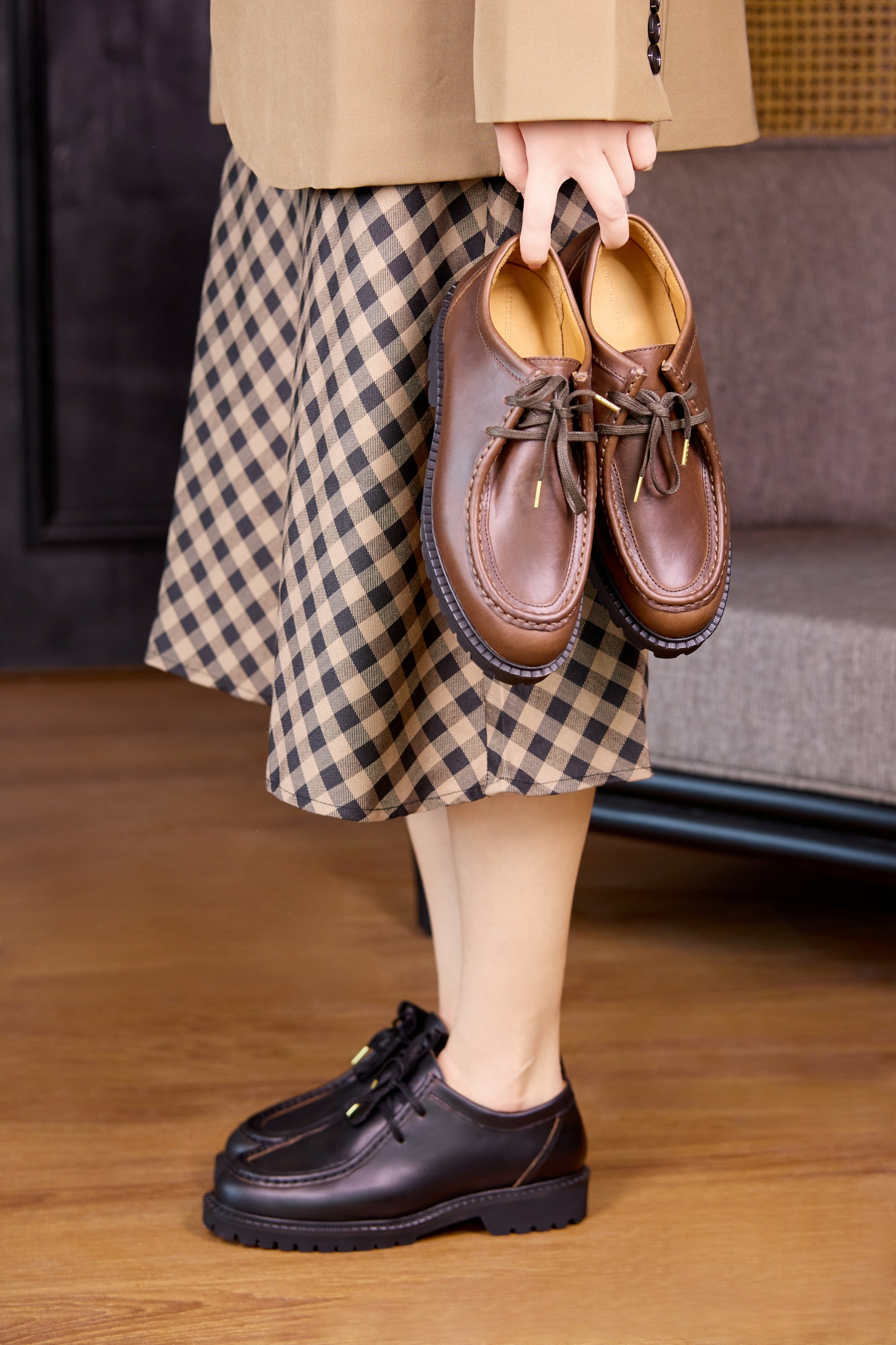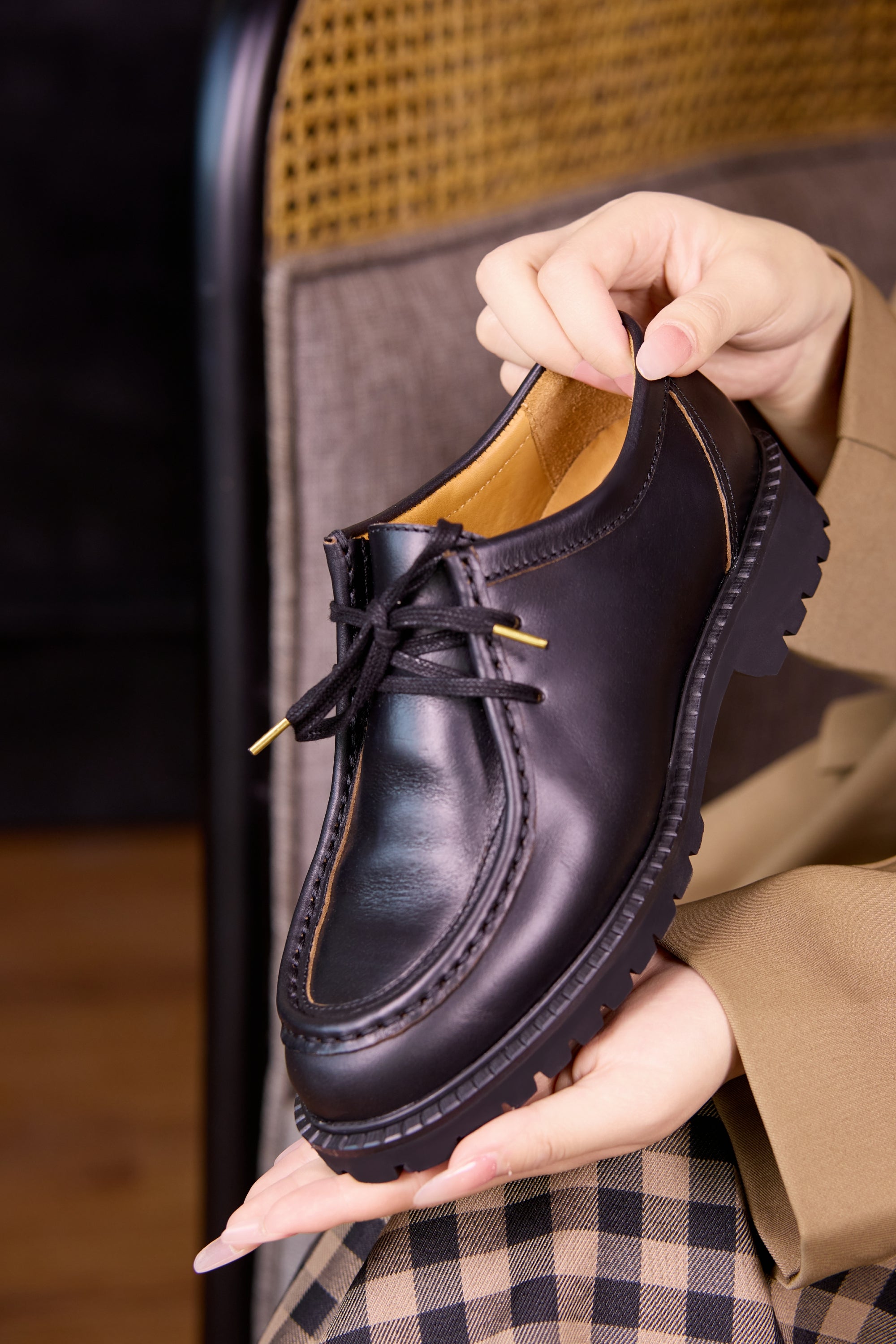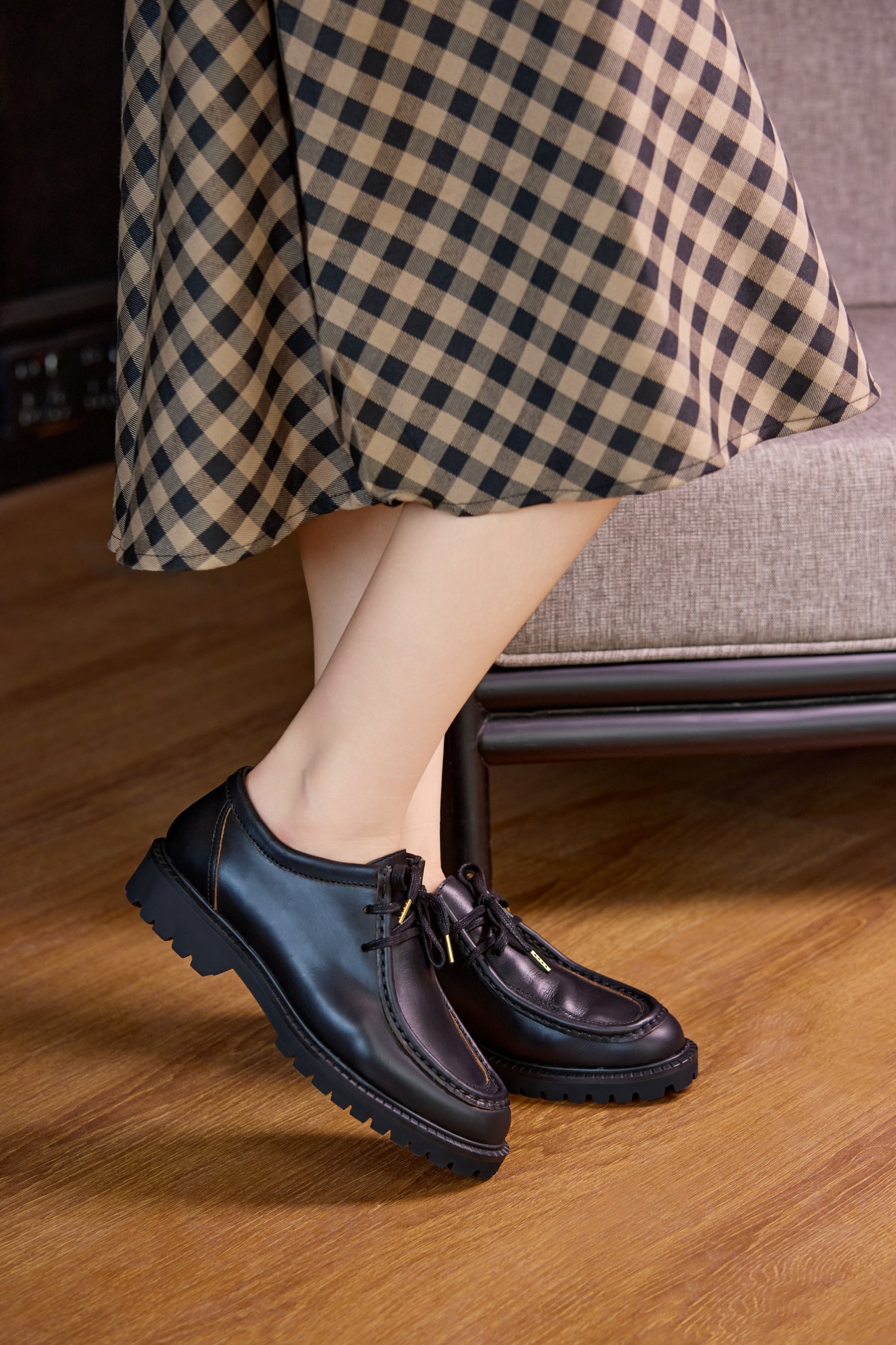 シンプルで洗練されたブラックカラーのレースアップシューズ。 程よく丸みのあるフォルムとステッチデザインが、落ち着いた中にもさりげない存在感を与えます。 安定感のある厚底ソールを採用し、クッション性にも優れているため、長時間の歩行でも快適な履き心地。 レースアップ仕様で足にしっかりフィットし、通勤や日常のお出かけにも安心して履いていただけます。 パンツスタイルはもちろん、スカートやワンピースにも合わせやすく、オン・オフ問わず活躍する万能デザイン。 毎日のコーディネートに取り入れやすい、定番として持っておきたい一足です。