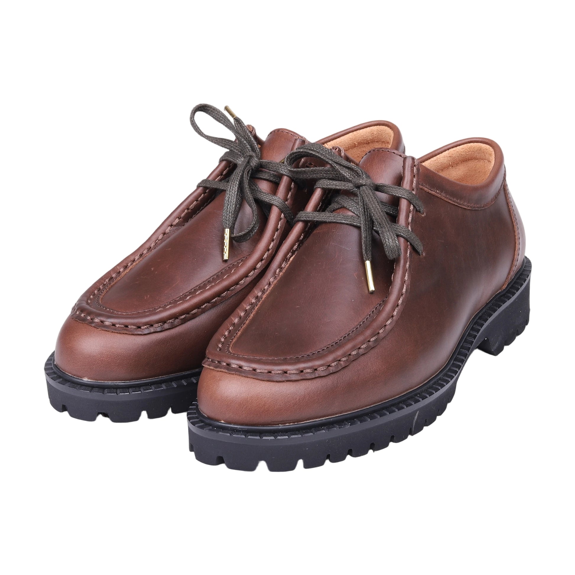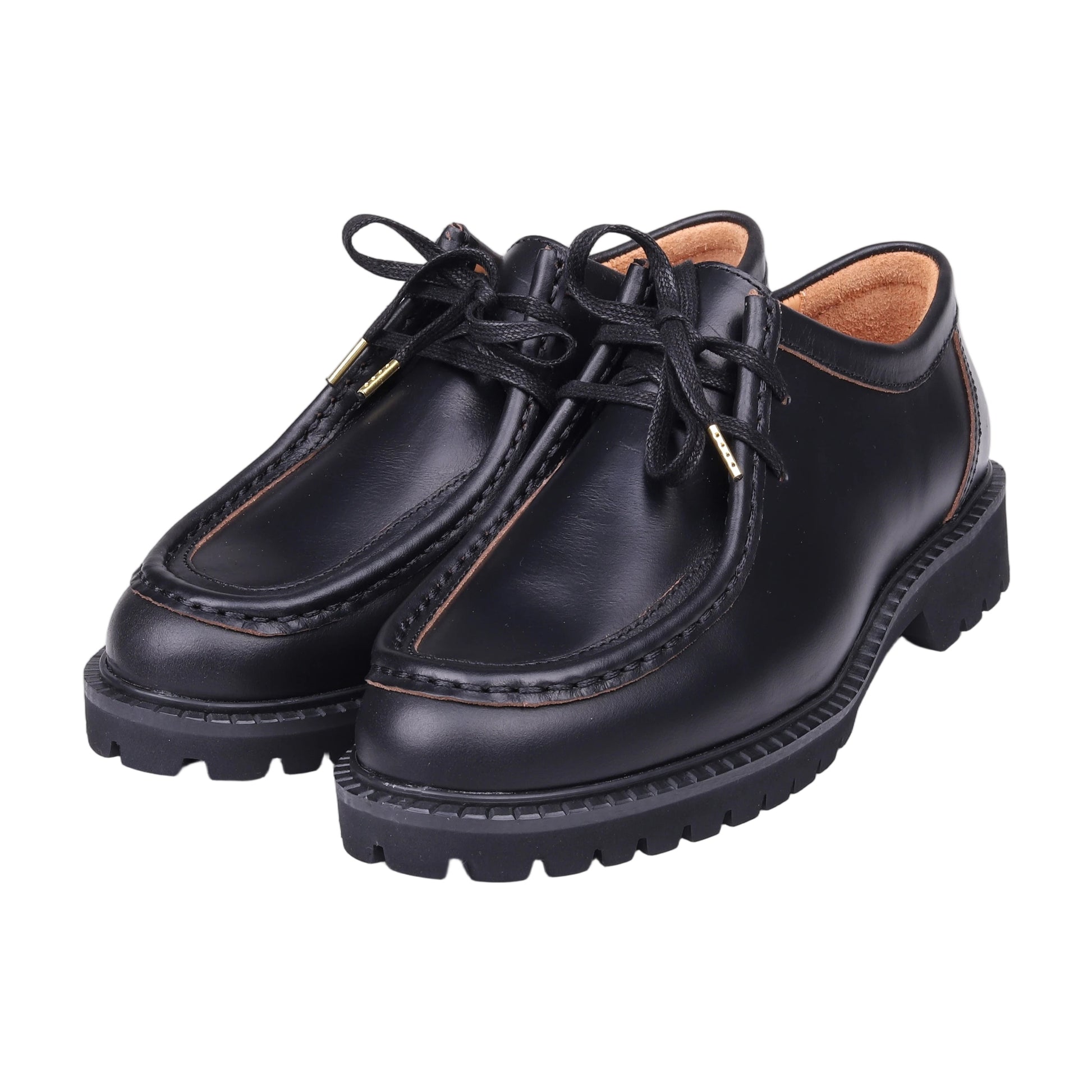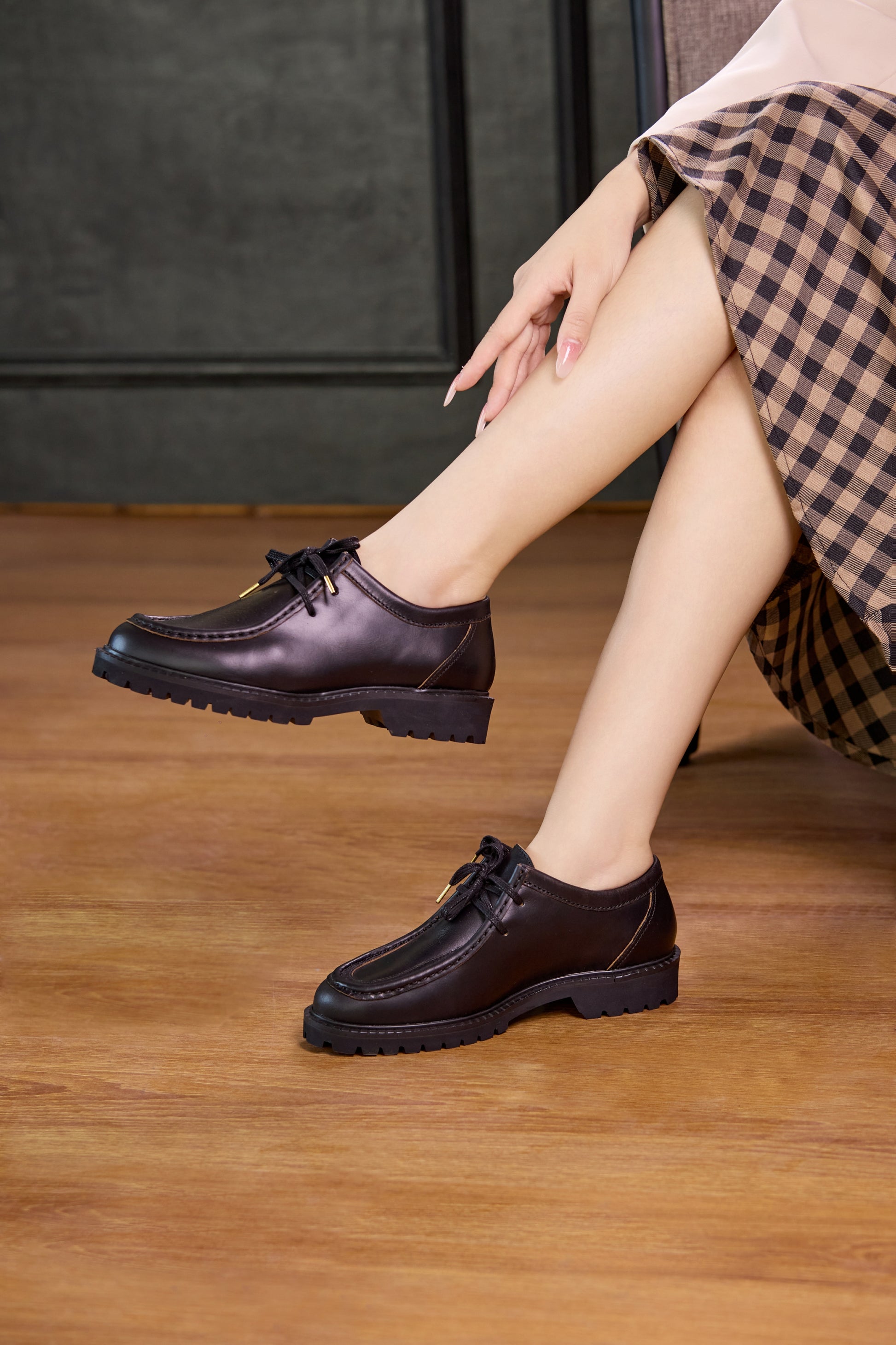 シンプルで洗練されたブラックカラーのレースアップシューズ。 程よく丸みのあるフォルムとステッチデザインが、落ち着いた中にもさりげない存在感を与えます。 安定感のある厚底ソールを採用し、クッション性にも優れているため、長時間の歩行でも快適な履き心地。 レースアップ仕様で足にしっかりフィットし、通勤や日常のお出かけにも安心して履いていただけます。 パンツスタイルはもちろん、スカートやワンピースにも合わせやすく、オン・オフ問わず活躍する万能デザイン。 毎日のコーディネートに取り入れやすい、定番として持っておきたい一足です。